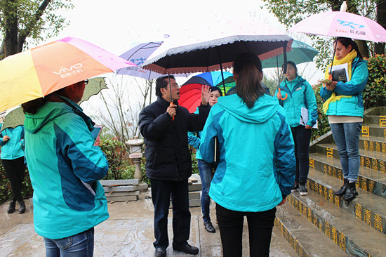 12月15日,院長李永明一行到長壽區(qū)菩提山風(fēng)景區(qū),對景區(qū)導(dǎo)游進(jìn)行《中華長壽寶典導(dǎo)游詞》的專題培訓(xùn)。當(dāng)天氣溫驟降,李院長帶領(lǐng)十多名導(dǎo)游,冒雨迎風(fēng),從山腳景區(qū)大門起步一路拾級而上直達(dá)山頂,用兩個多小時時間,比照一個個景點(diǎn)及相關(guān)導(dǎo)游詞,考察導(dǎo)游們對導(dǎo)游詞熟悉領(lǐng)會、把握講解情況,并多次模擬示范,深入淺出講解,并根據(jù)景點(diǎn)實(shí)際添加新鮮內(nèi)容。導(dǎo)游們學(xué)習(xí)非常用心,一致評價李院長的導(dǎo)游詞寫得有文采,講得更生動,她們熟悉導(dǎo)游詞的過程不僅僅是為了工作,更是學(xué)習(xí)中華文明、了解重慶和長壽地脈文脈與歷史人文、豐富知識和人生的寶貴機(jī)會。