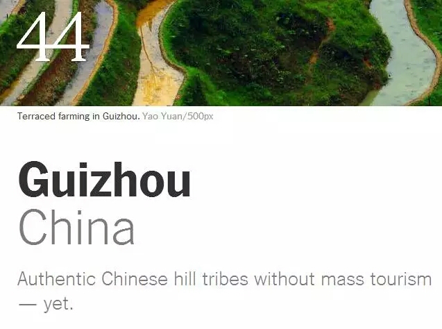 近日,《紐約時報》公布了2016年世界上52個最值得到訪的旅游目的地(即“必到旅游勝地推薦”),中國僅有貴州和杭州上榜。
