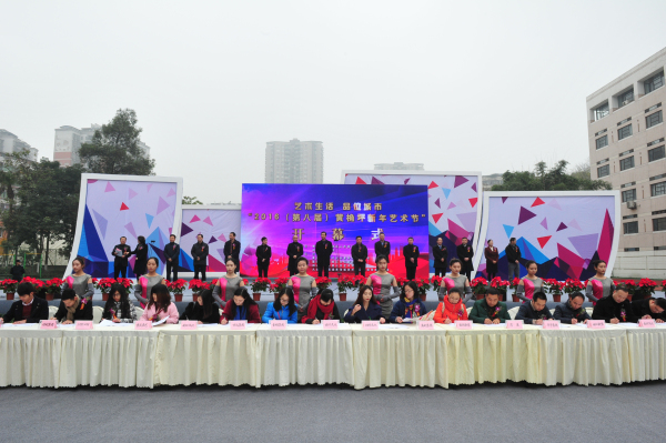 2015 年12月31日上午,2016(第八屆)黃桷坪新年藝術(shù)節(jié)在四川美術(shù)學(xué)院黃桷坪校區(qū)運(yùn)動場盛大開幕,重慶市旅游局局長劉旗,重慶市文化委副主任雷平,四川美院黨委書記黃政、院長龐茂琨,九龍坡區(qū)委書記丁洪,九龍坡區(qū)委副書記、區(qū)政府區(qū)長石繼東,九龍坡區(qū)人大主任潘平,九龍坡區(qū)政協(xié)主席鄭和平,九龍坡區(qū)委常委、副區(qū)長劉小強(qiáng),九龍坡區(qū)委常委、宣傳部長王南,九龍坡區(qū)委常委、區(qū)委辦公室主任顏朝華,九龍坡區(qū)人大副主任曾熔,九龍坡區(qū)政府副區(qū)長戎蓉,九龍坡區(qū)政協(xié)副主席孫夢等領(lǐng)導(dǎo)和嘉賓出席了開幕式。開幕式由四川美院黨委副書記左益主持。